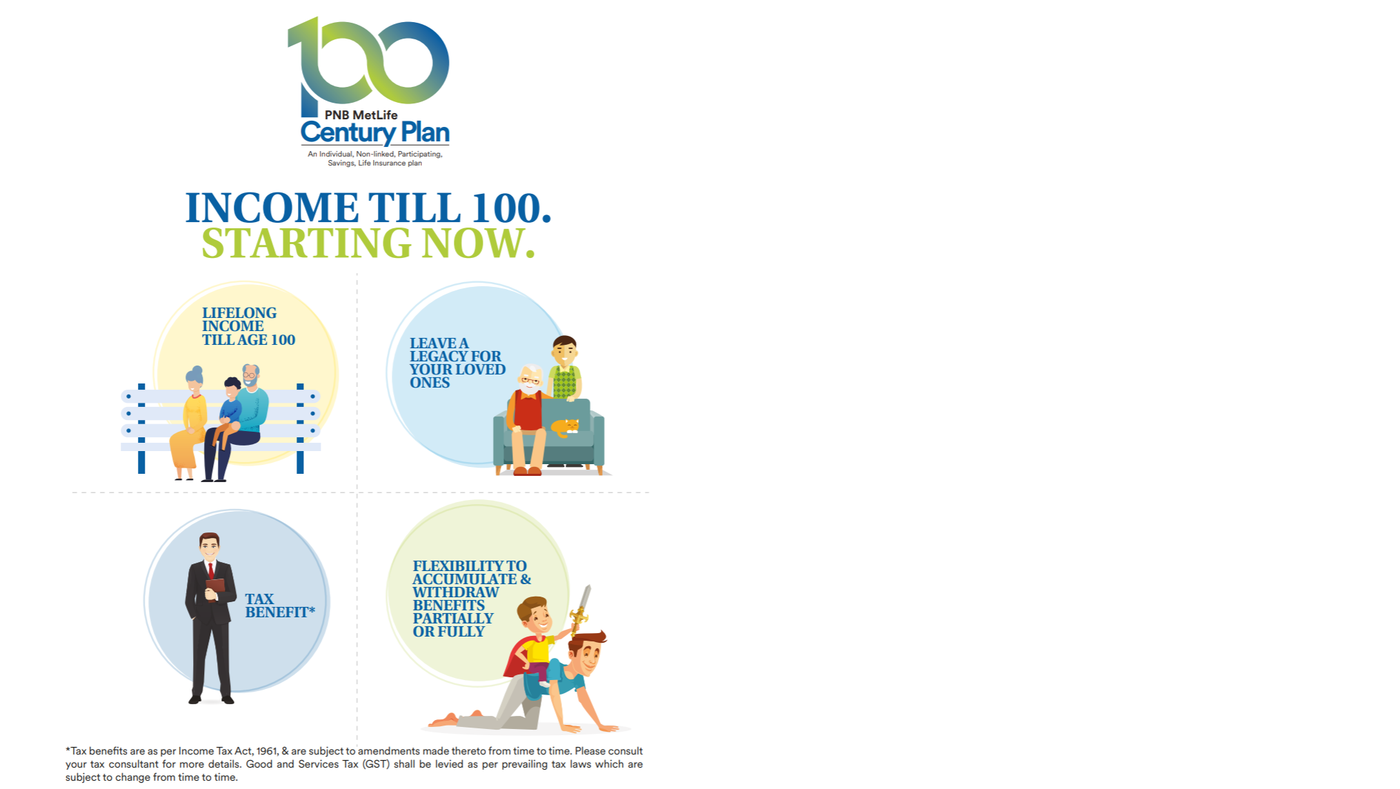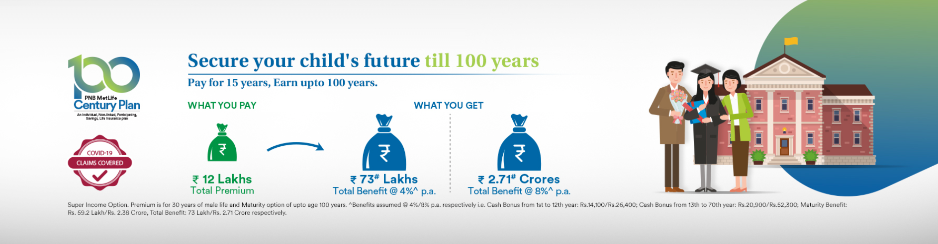 As you grow your responsibilities grow. You dream of a house, a world tour, worry-free retirement years and much more. However, life may not go as per our plan and its uncertainties could make you compromise on your dreams. Presenting PNB MetLife Century Plan, a participating life insurance plan that provides you an opportunity to fulfill your dreams, secure your future with an income till age 100 years along with a lifelong cover. Ensure a second income for your retirement years and build a legacy for future generations.